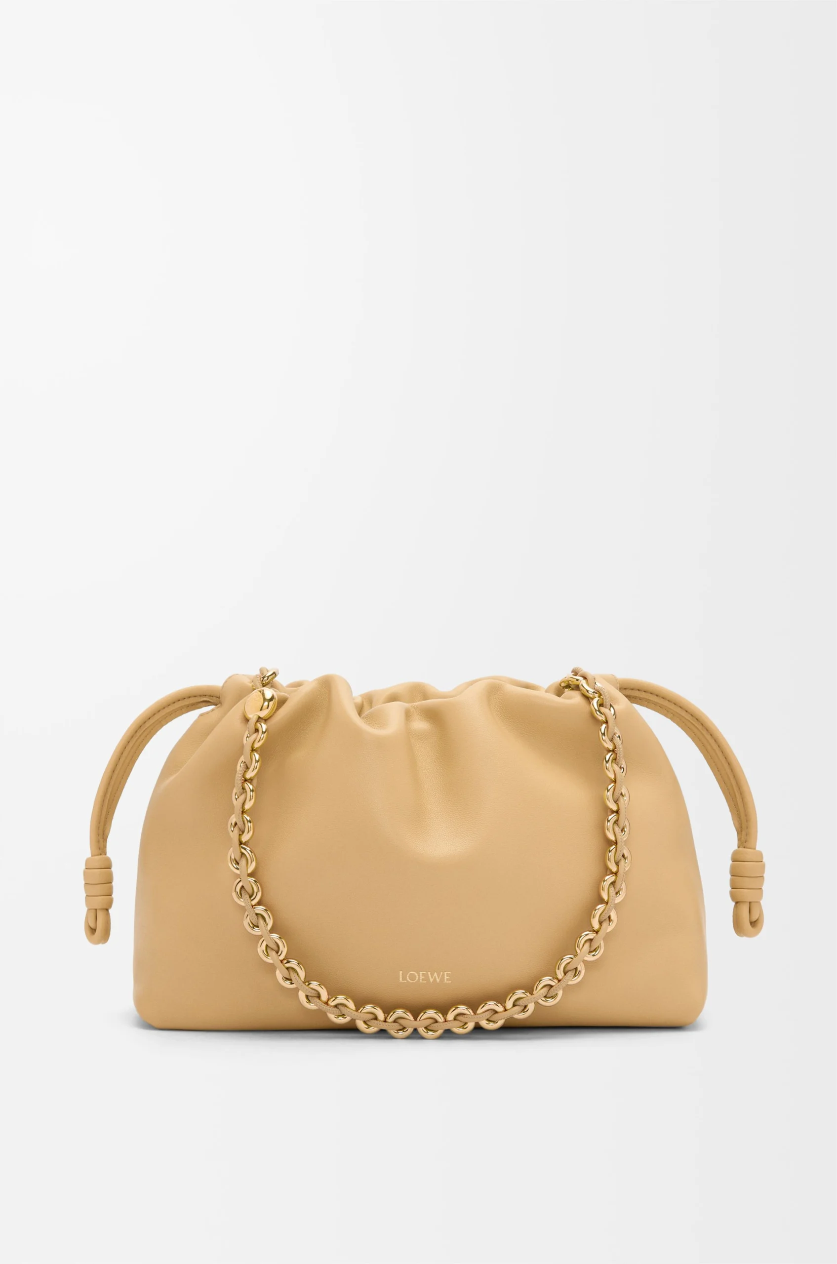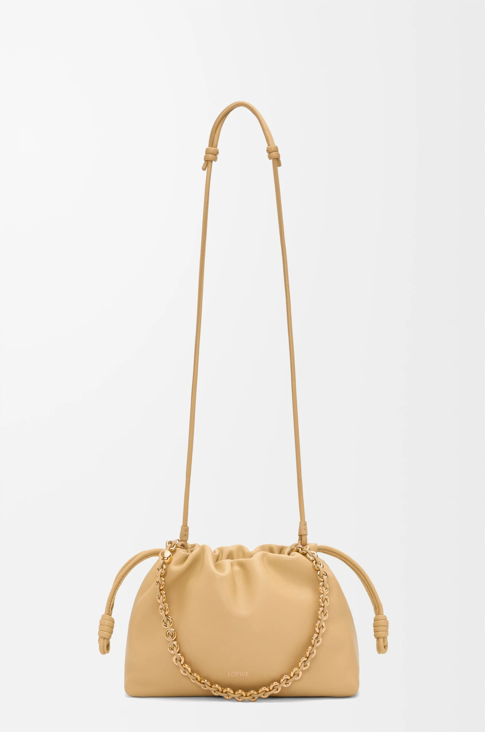 The Flamenco purse is a lightweight and soft bag with a ruched shape, historical knot drawstrings and a donut chain. This medium